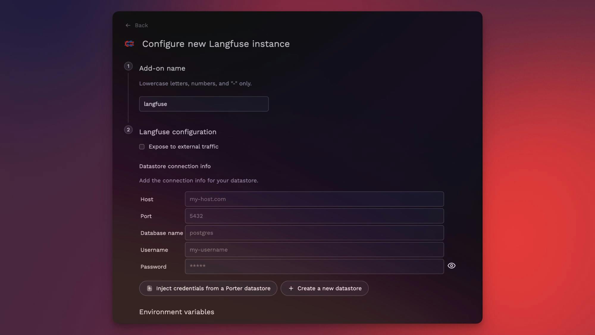 The add-on automatically configures the necessary environment variables, handles HTTPS and custom domains, autoscales the application, and allows you to connect your Porter-managed Postgres database to Langfuse by injecting the credentials.
